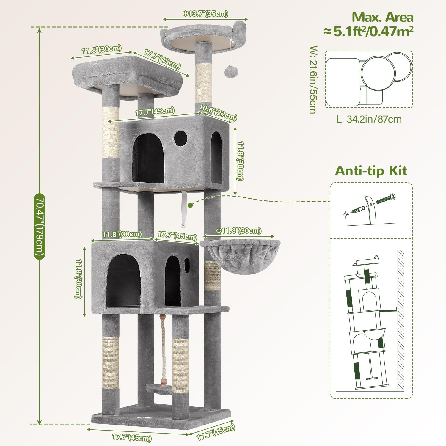 - HEIGHT: Standing at 70 inches tall, this cat tree offers ample space for climbing, meet your cat's needs for climbing, observing, and playing. Allow your cat to explore at different heights, keeping them active and curious