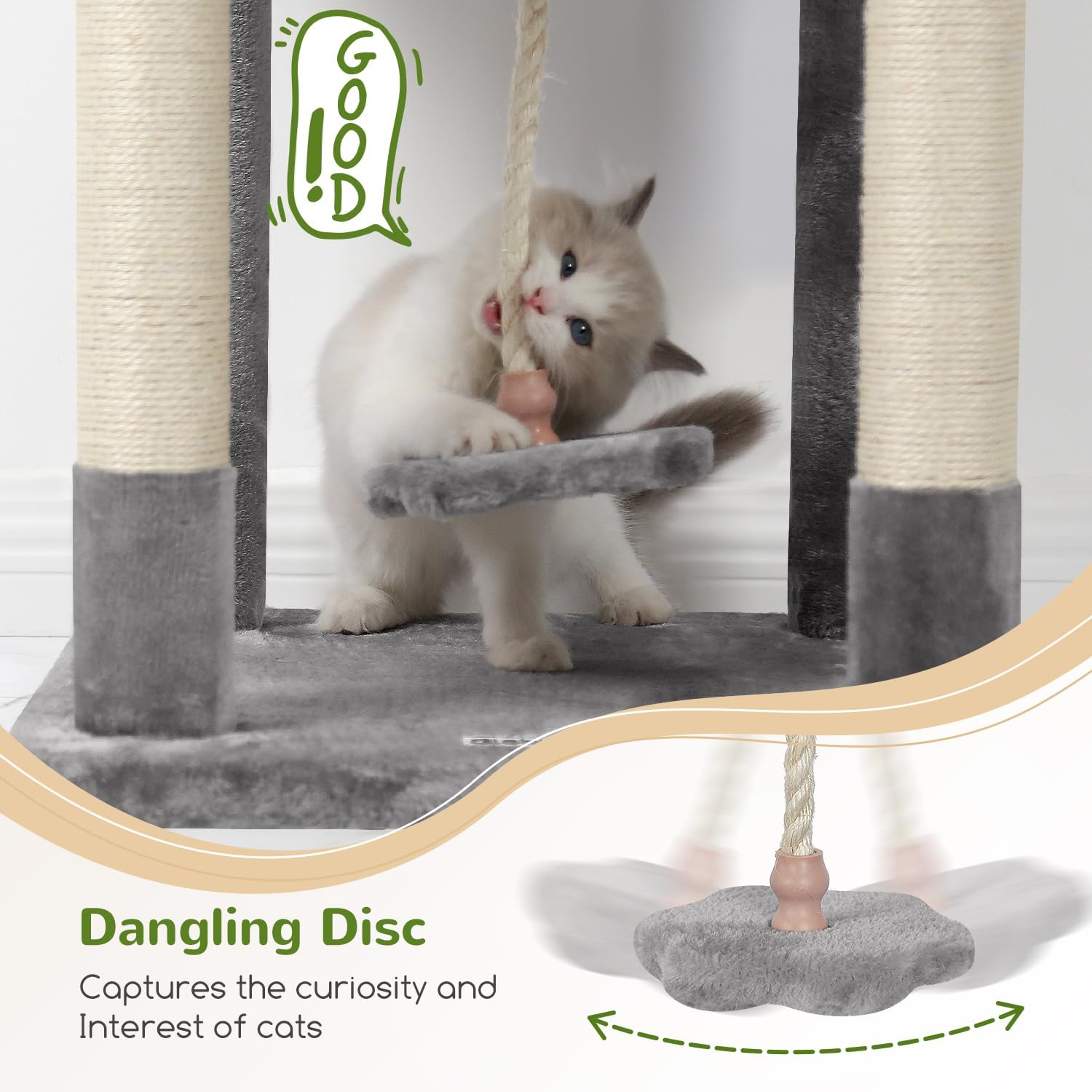 - CREATIVE SISAL ROPE: The pink cat tower addition of the small flower disc enhances the dangling effect of the sisal rope on this cat condo for indoor cats. Additionally, when lightly swayed or touched by the cat, the rope starts to create a dynamic effect similar to that of a pendulum. This dynamic and visually stimulating feature captures the curiosity and interest of cats, increasing playfulness and interaction
