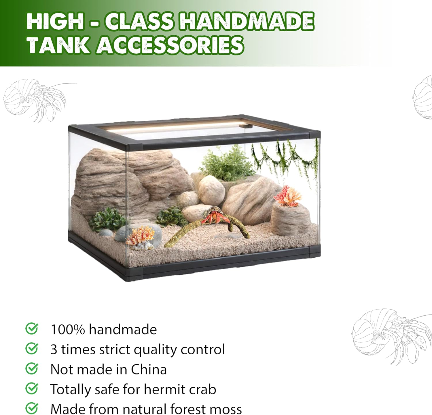 - π¦ π₯πππ ππ’π₯ππ¦π§ π π’π¦π¦ π ππ§ππ₯πππ: Crafted from carefully selected natural forest moss, this hermit crab tank accessories product retains its natural green color and mild earthy scent. Unlike synthetic products, it offers a familiar, nature-inspired environment that helps hermit crabs adjust better and supports humidity retention when misted or soaked.