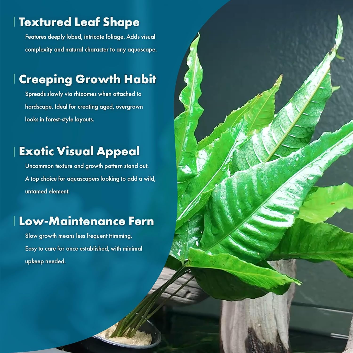 - This slow-growing rhizome thrives when attached to driftwood or stone and is favored by aquascapers for its ease of care, structure, and compatibility with shrimp tanks.