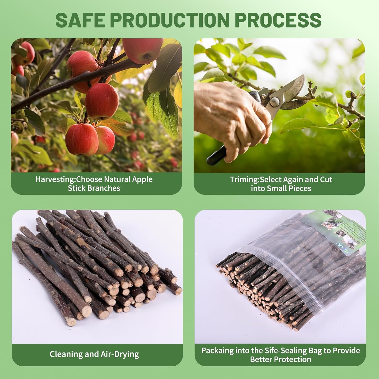 - Sealed Snack Packaging: After screening, trimming, soaking, rinsing, drying and packing, etc. It can not only maintain the original fragrance of fruit trees, but also make the apple branch sticks more clean, hygienic and tidy, which will make your baby obsessed with it.