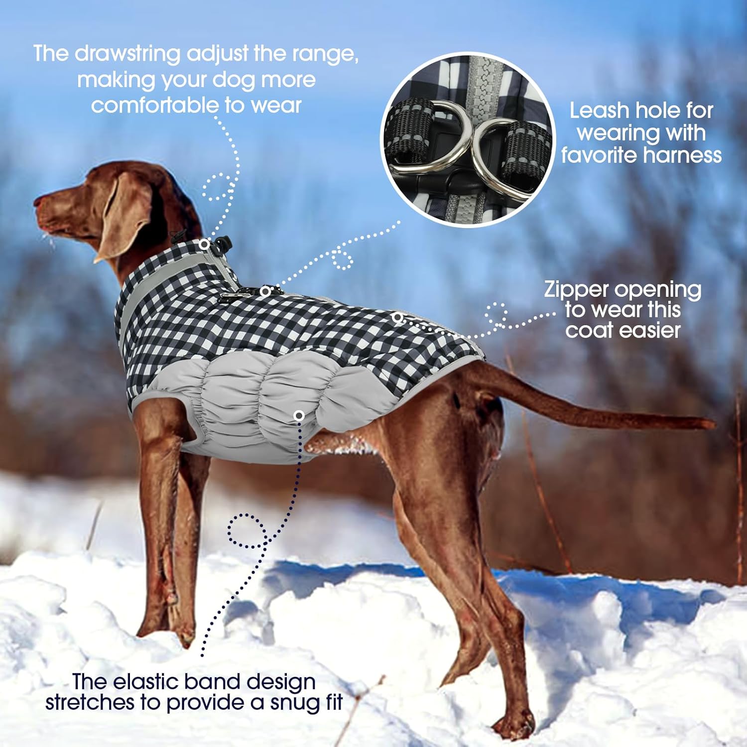 FUAMEY Dog Coat for Large Dogs,Waterproof Dog Winter Jacket with Harness Built in Puppy Cold Weather Coats Reflective Pet Vest with Zipper Warm Fleece Dogs Snowsuit Windproof Checkerboard L