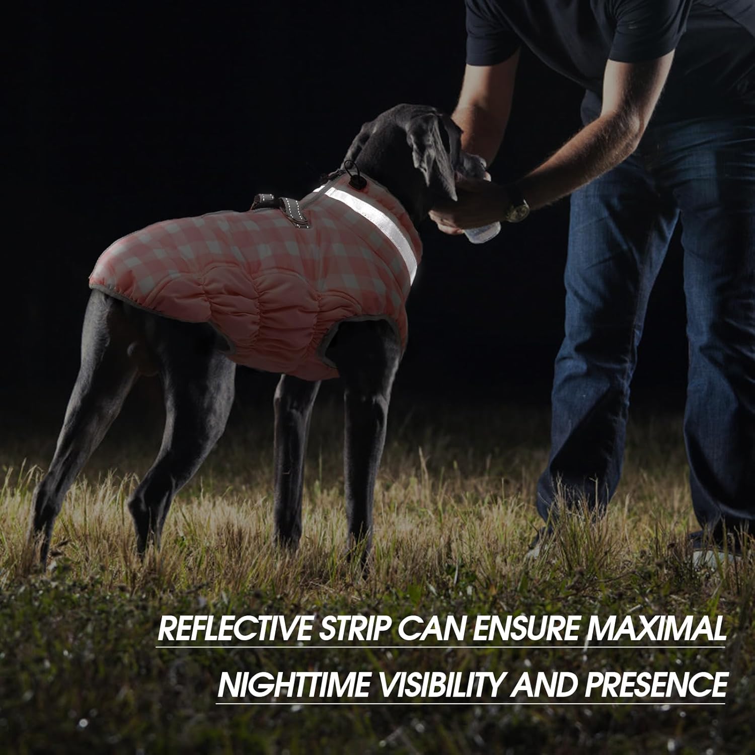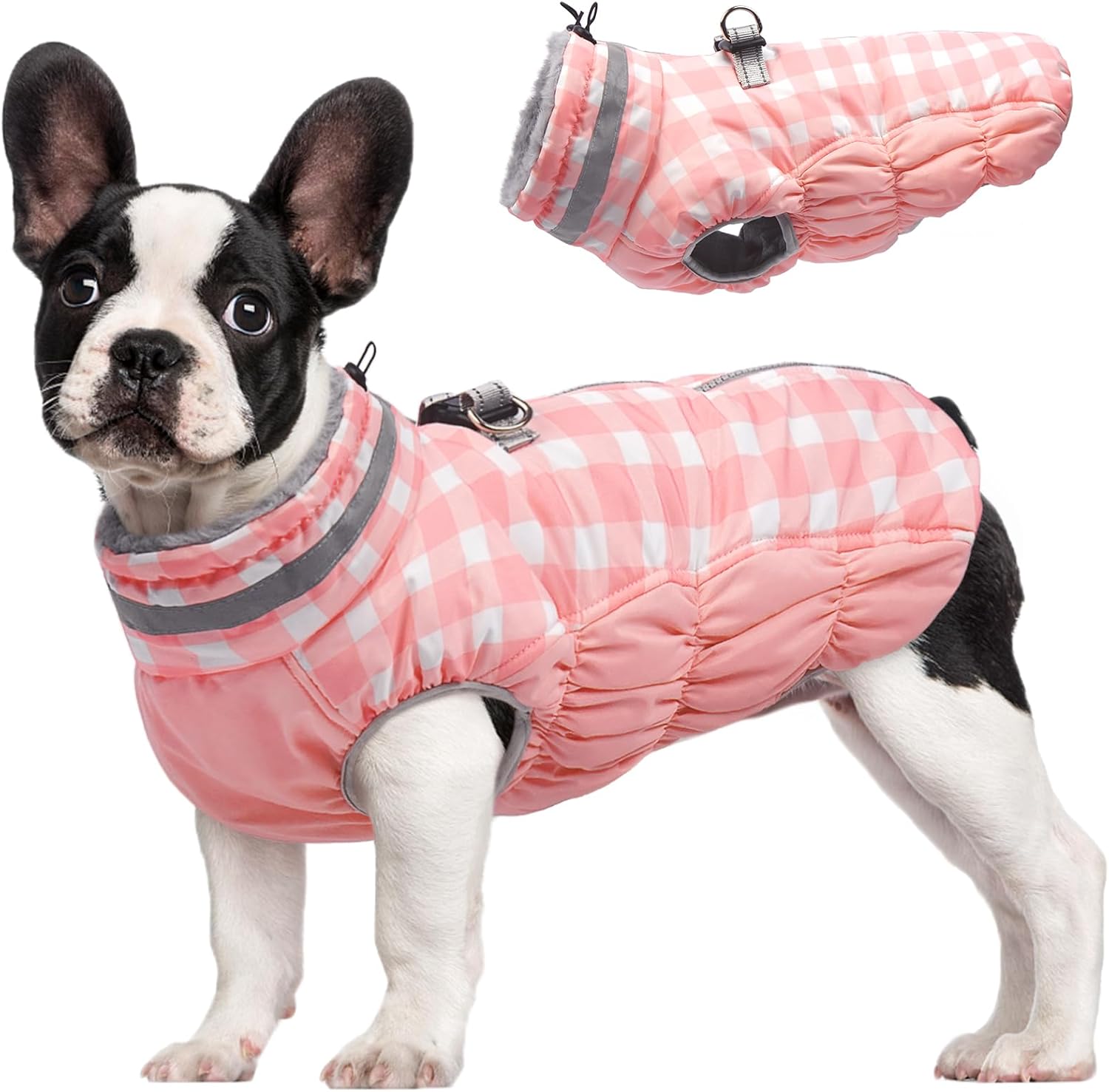 FUAMEY Dog Coat for Small Dogs,Waterproof Dog Winter Jacket with Harness Built in Puppy Cold Weather Coats Reflective Pet Vest with Zipper Warm Fleece Dogs Snowsuit Windproof Pink Plaid S