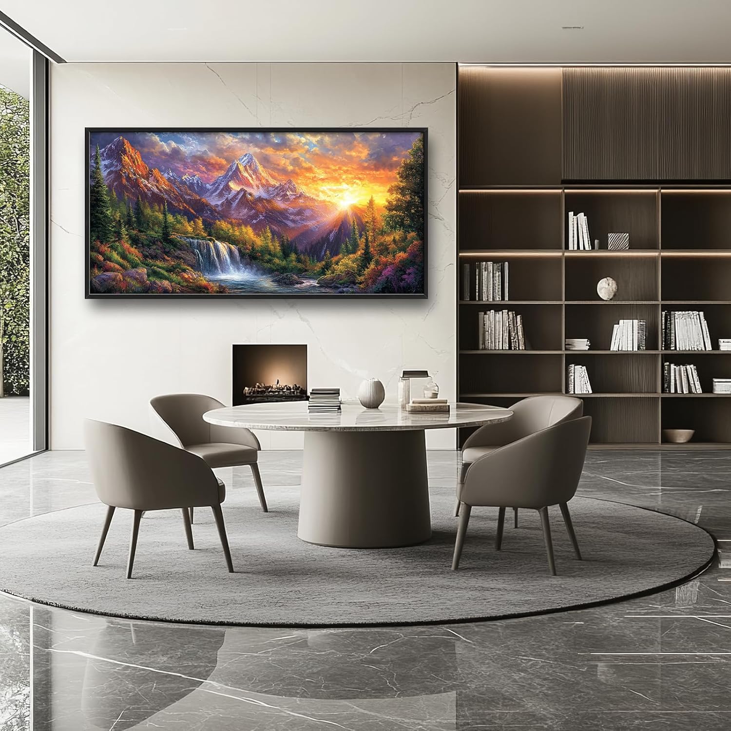 Large Mountain Tree Wall Art for Living Room, Framed Oversized Sunset Waterfall Wall Decor Nature Landscape Canvas Painting Modern Artwork for Living Room Bathroom Bedroom Office Dining Room 60"x30"