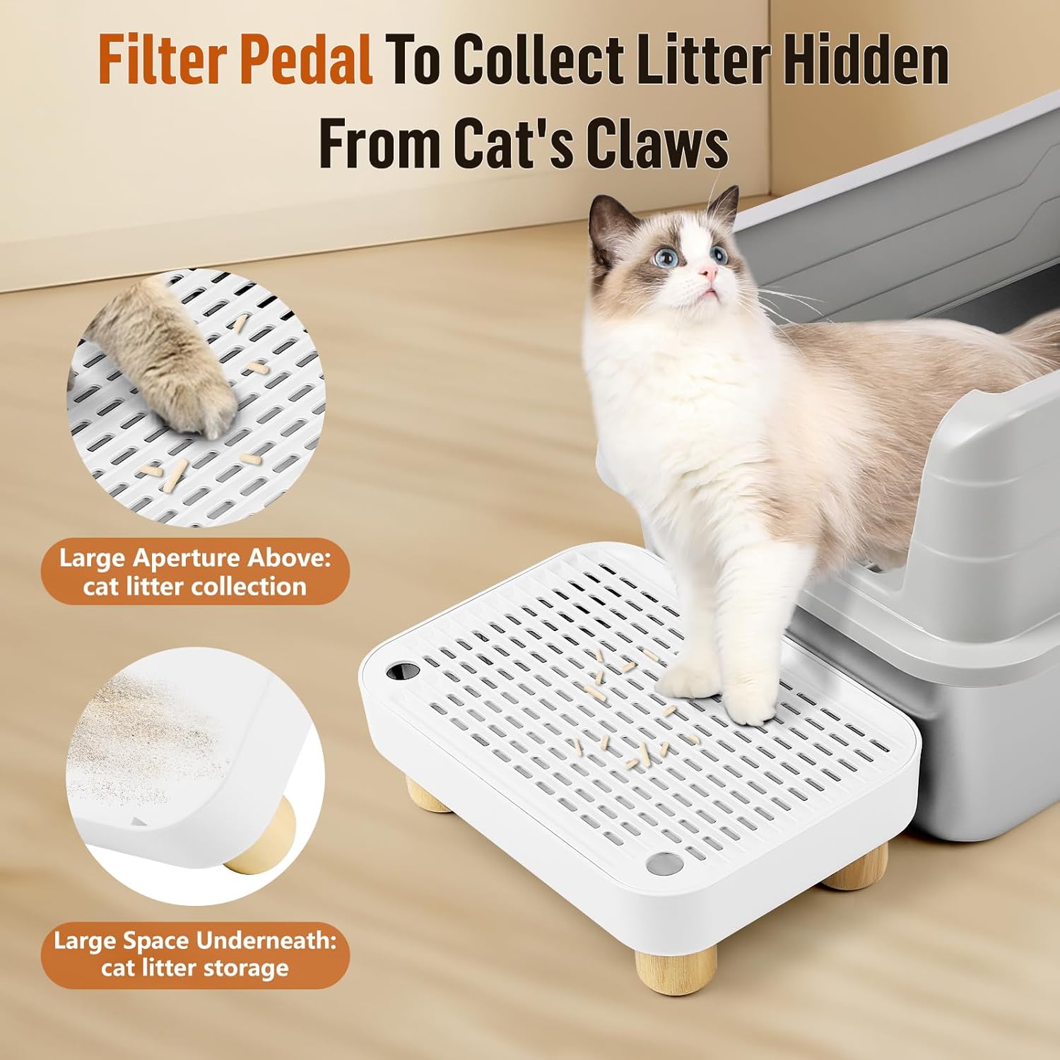 - Easy to Clean: The cat litter tray stair features large aperture plastic panel and a curved litter leakage opening. This design can collect cat litter hidden in cat paws and quickly open the filter pedal for easy cleaning.