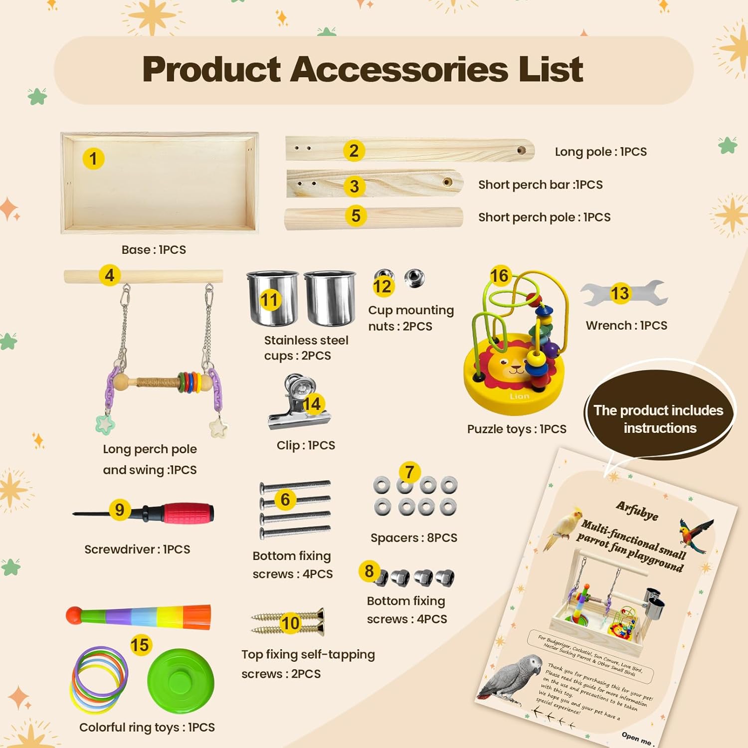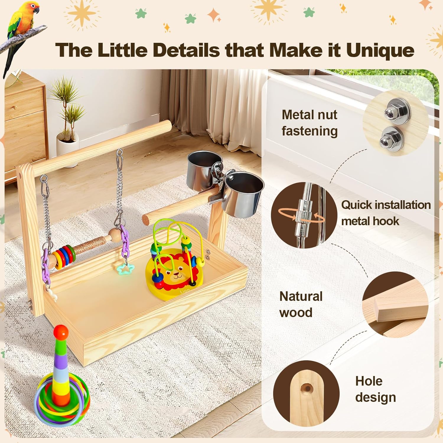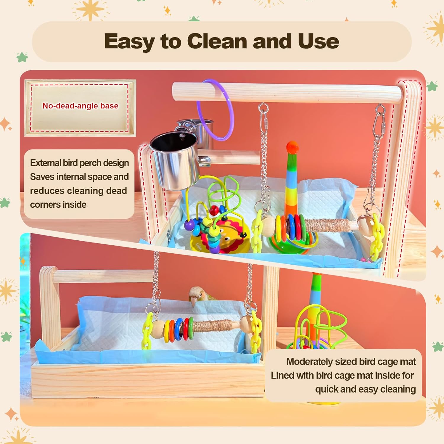 - Easy to Install and Clean: Parakeet playground features a nut fastening design and comes with detailed instructions, greatly reducing the difficulty of installation. The dead-angle-free base and birdcage pad make cleaning quick and easy