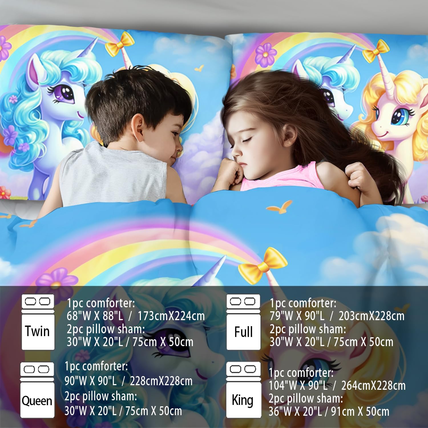 Unicorn Comforter Set Queen,Kawaii Unicorn Bedding Set Queen Kids,Rainbow Comforter Blue Bedroom Decor,Cute Animal Bedding Rainbow Bed Decor for Girls,Cartoon Blue Floral Quilt