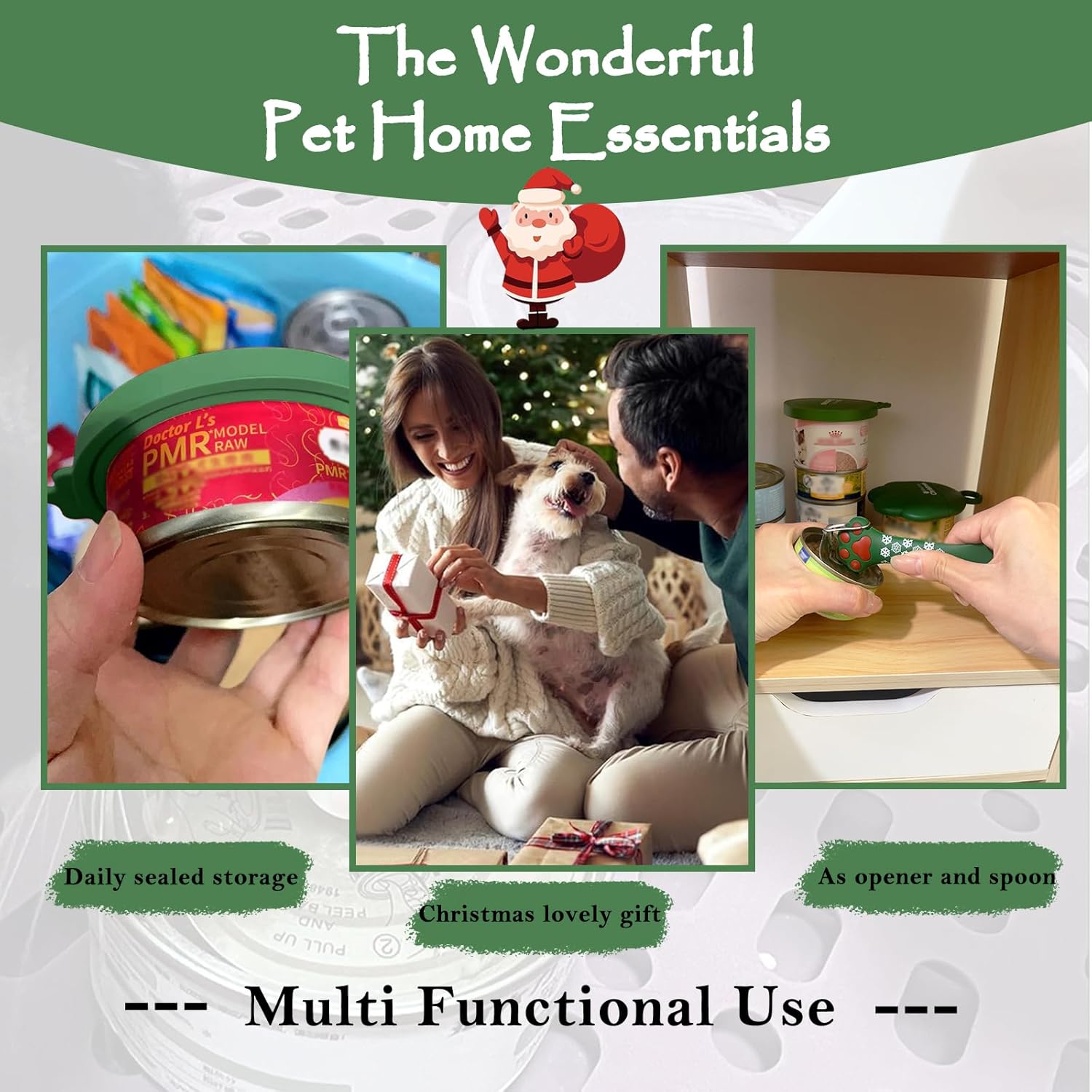 Christmas Pet Set - 3 Cat Food Can Lids & 1 BPA-Free Can Opener | Cute Paw Shape Opener Spatula Spoon for Wet Food | Silicone Spoon & Covers for Dog Cat - Christmas Green