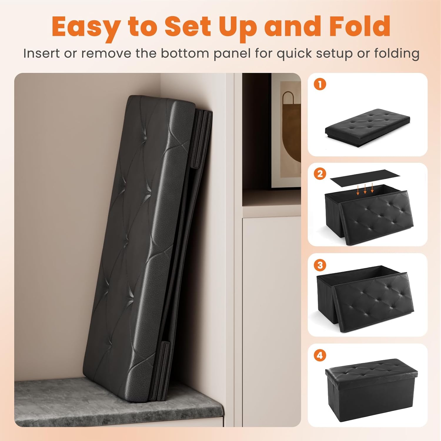 - 【Sets Up in Seconds & Saves Space】Don’t sweat assembly! Your Sweetcrispy ottoman with storage folds flat when you’re done using it—slide it under your bed, prop it in a closet, or stash it anywhere. Seriously, unfold → snap the base → load it up → done. That’s it!