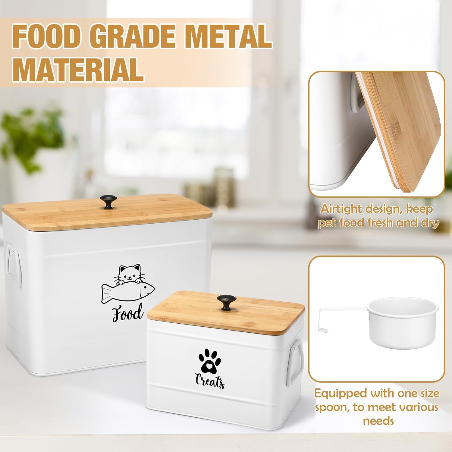 - Practical Design: airtight bamboo lid keep pet food fresh and dry, and make sure that treats are easy to access for you yet sealed for your pet; The decorative cat food canister set is equipped with a spoon, meet your various needs, such as dry and wet food separation; And the decorative pet food container comes with replaceable sealing rubber ring, if you think the current sealing effect of the lid needs to be improved, you can try using the spare sealing ring