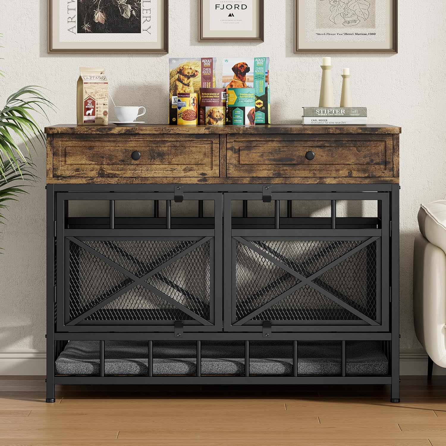 IRONCK 44 inch Large Dog Crate Furniture, Wooden Dog Kennel with Storage Drawers for Medium/Large Dogs, Decorative Dogs Kennel Indoor, Rustic Brown