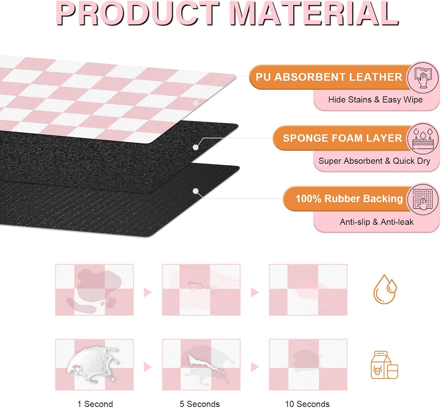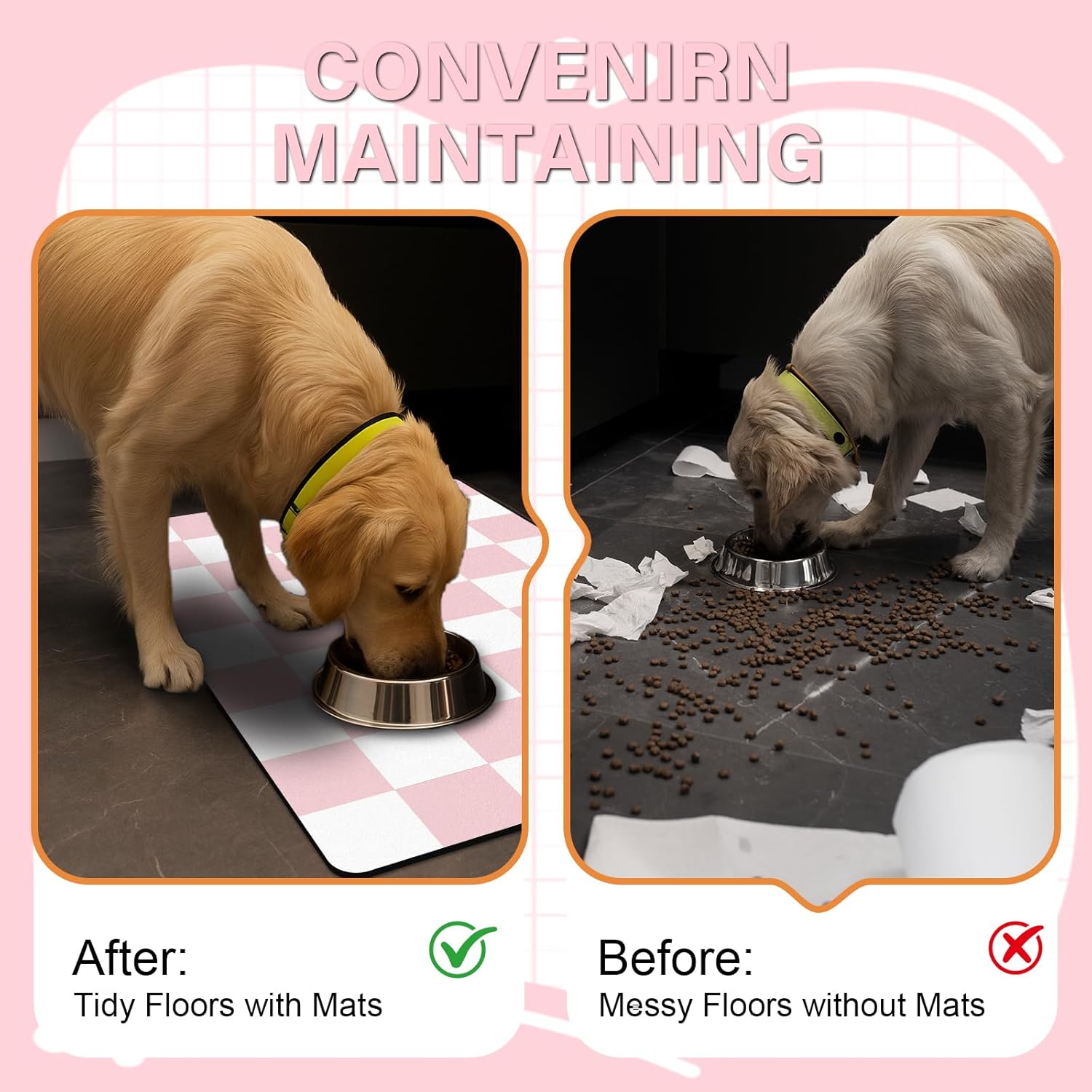 Checkered Dog Cat Feeding Mat, 17'' x 28'' Large Dog Food Mats, Absorbent Pet Feeding Mat for Food and Water Bowl, Dispenser, Checkerboard Pet Placemat with Rubber Backing, Pink & White