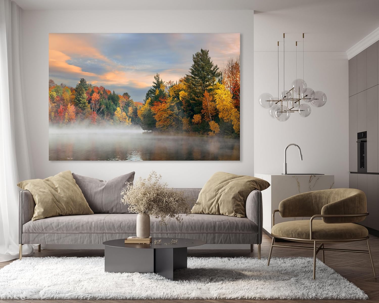 Nature Wall Art Prints - Ocean Forest Mountain Lake Canvas Landscapes - Small to Extra Large Living Room Bedroom Kitchen Bathroom Décor (Misty Fall Reflection, 24L" x 36W")